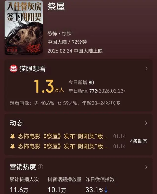 “零排片”这三个字,比任何鬼片都吓人。2月24日早上,影院经理打开排片表,《祭屋》像被抹掉的幽灵,全国只给0.1%的缝隙,连猫眼的票房曲线都懒得画——直接空白。观众还没被吓哭,片方先被现实吓瘫。