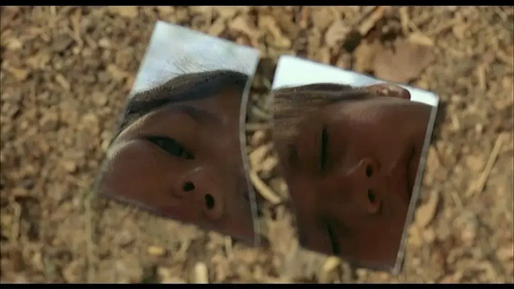 还有一个让我印象很深的片段,就是男孩误摔了女孩的随身镜后,他们低下头,碎裂成两片的镜子各映出二人的稚嫩脸庞。这也颇像《重生》中的这段意味深长的文字:“一个躯体在时间的线条上旅行,
