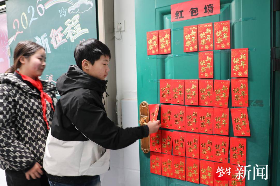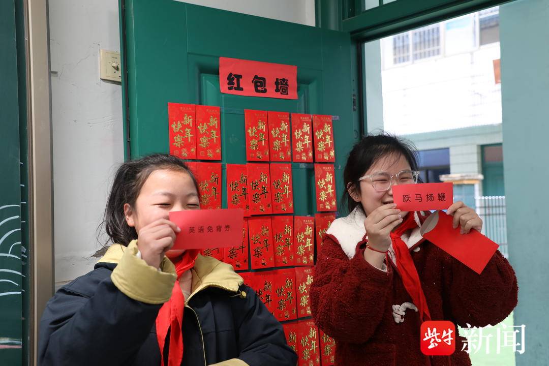 同时,各班级还组织发“红包”送祝福送惊喜活动。“红包”里有诸如“一马当先”“龙马精神”“马到成功”等一系列祝福语,更有装着“语文免背券”、数学“免写作业券”、“英语免背券”等字样的“福利”,让孩子们享受开学的意外之喜,对新学期充满期待。