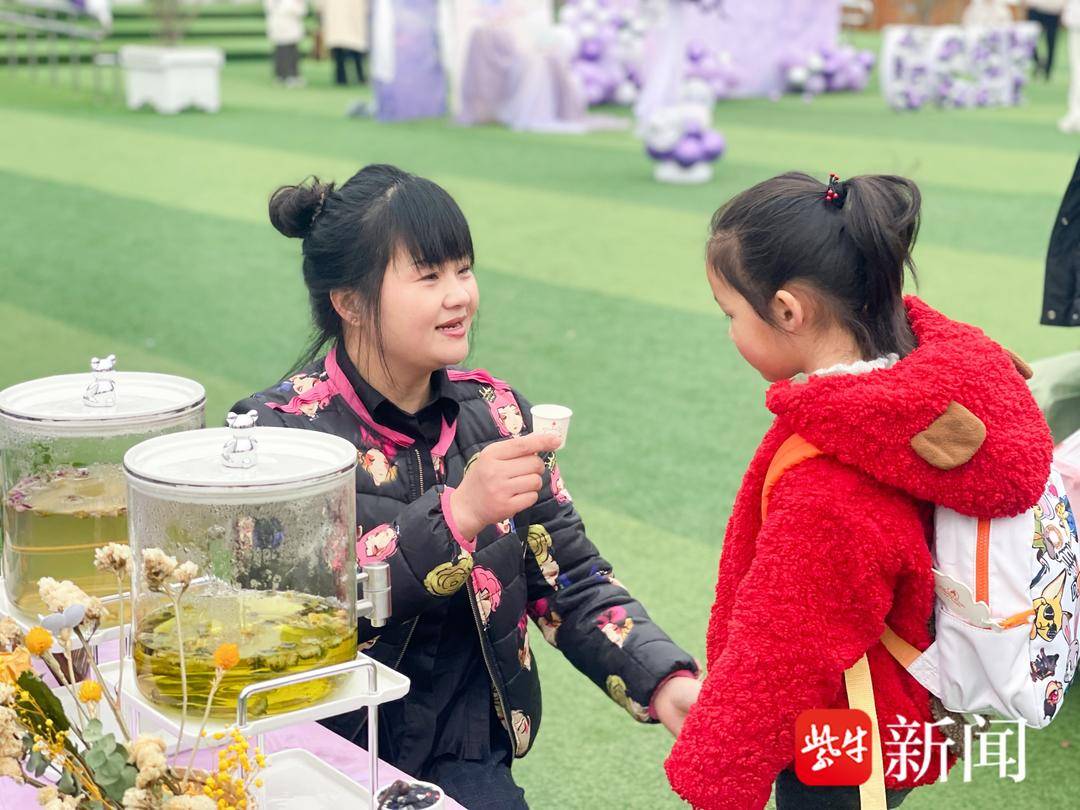 活动围绕春日意象,设置贴春、舀春、吟春、盼春等八处沉浸式互动体验区。幼儿或走近“贴春签到墙”,亲手贴上一朵自己喜欢的小花;或用小勺将五谷舀入透明小碗,放进竹编托盘;或手拿小号毛笔,在宣纸百花盛开背景图上点画新芽、花苞。“今天,老师给我喝了花茶,夸我口哨吹得好。我太高兴了。谢谢老师!”射阳县港城实验幼儿园幼儿朱锦萱圆润的笑脸红扑扑的。