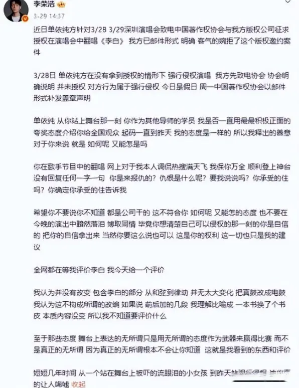 李荣浩再发文四连问,晒出音著协确认邮件:无可授权第三方,请问你用什么立场、什么权利、什么角度、什么心态演唱?. 红星新闻-百家号. [2026-03-29].