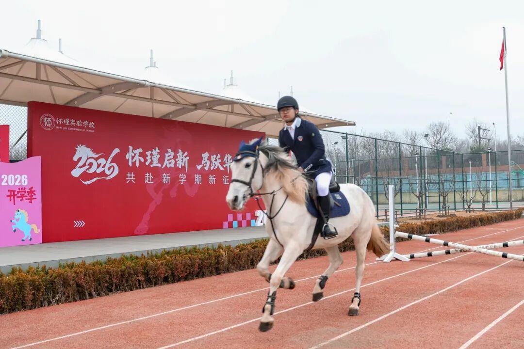 典礼最后,特色课程马术展示精彩上演,表演者们身着专业服饰,与骏马配合默契,展现出优雅的姿态与昂扬的精神,将马年“奋勇争先”的寓意展现得淋漓尽致,赢得了师生们的阵阵欢呼与掌声,也为开学典礼画上了圆满的句号。